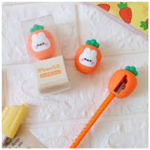 Dale un toque de ternura a tu escritorio o cartuchera con este adorable Sacapuntas + Borrador Zanahoria Conejo. Es el accesorio perfecto para estudiantes y amantes de la papelería "aesthetic" que buscan herramientas funcionales con diseños únicos. Su tamaño compacto, tiene su forma amigable lo convierten en el compañero ideal para tus horas de estudio.